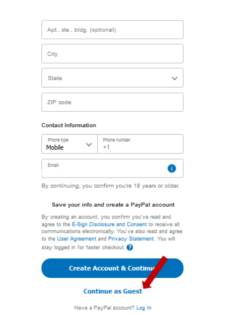 In the next page enter your debit or credit card information. You will need to enter your name, card number, security code, expiration date, and billing address as usual and click `continue as gust` to complete the payment .